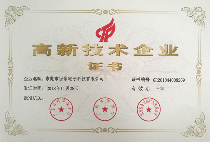 近日,經(jīng)國家科技部、財(cái)政部、國家稅務(wù)總局專家評審,東莞市恒帝電子科技有限公司獲得了由廣東省科技廳、財(cái)政廳、省國稅局、省地稅局聯(lián)合頒發(fā)的《高新技術(shù)企業(yè)》證書,這標(biāo)志著我司成為國家高新技術(shù)企業(yè)的一員。